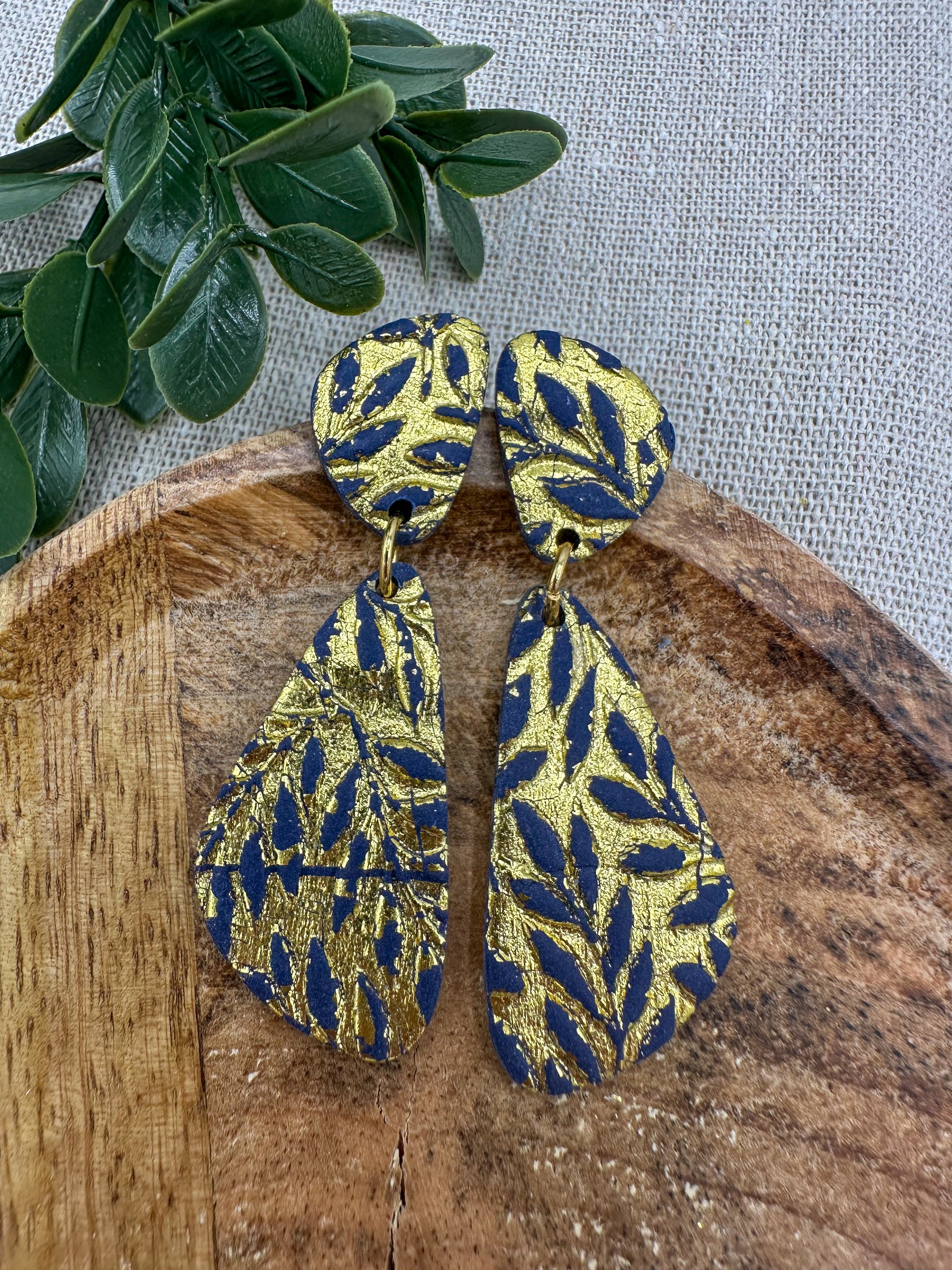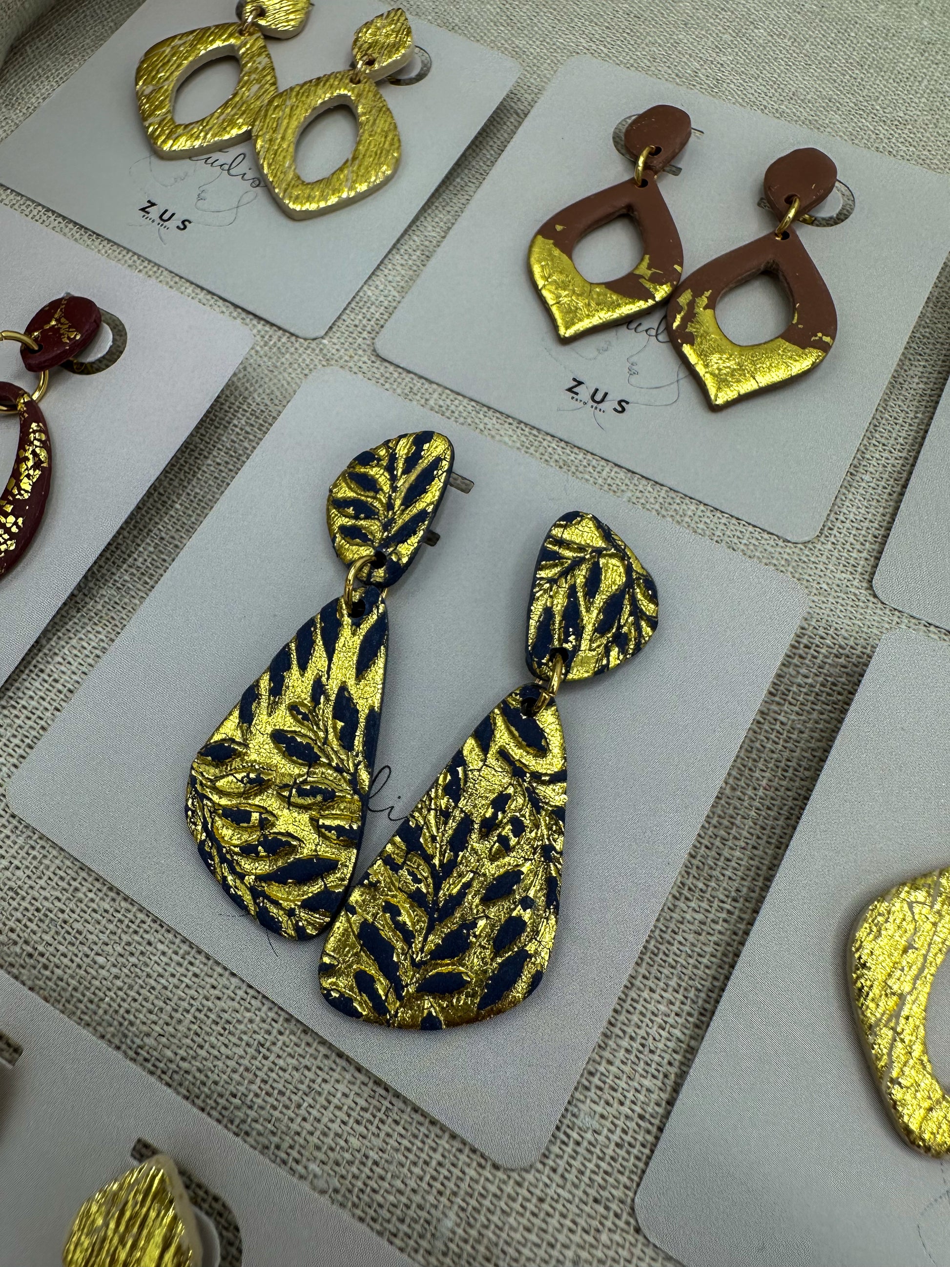 De oorbellen Noël Chic brengen glamour en verfijning samen. Het donkere basismateriaal met gouden bladpatroon geeft een luxe, feestelijke uitstraling — perfect voor kerst of oudjaar.