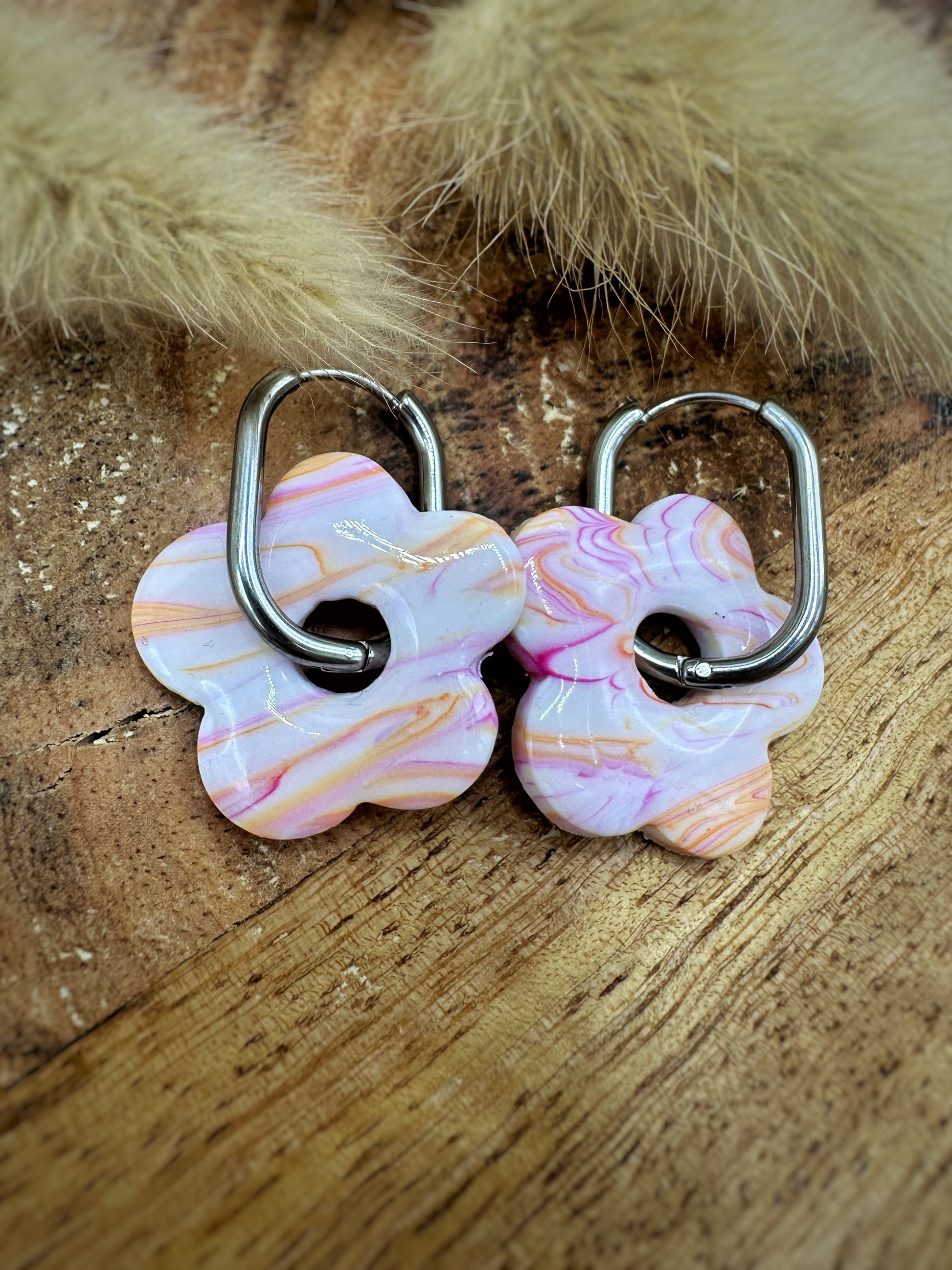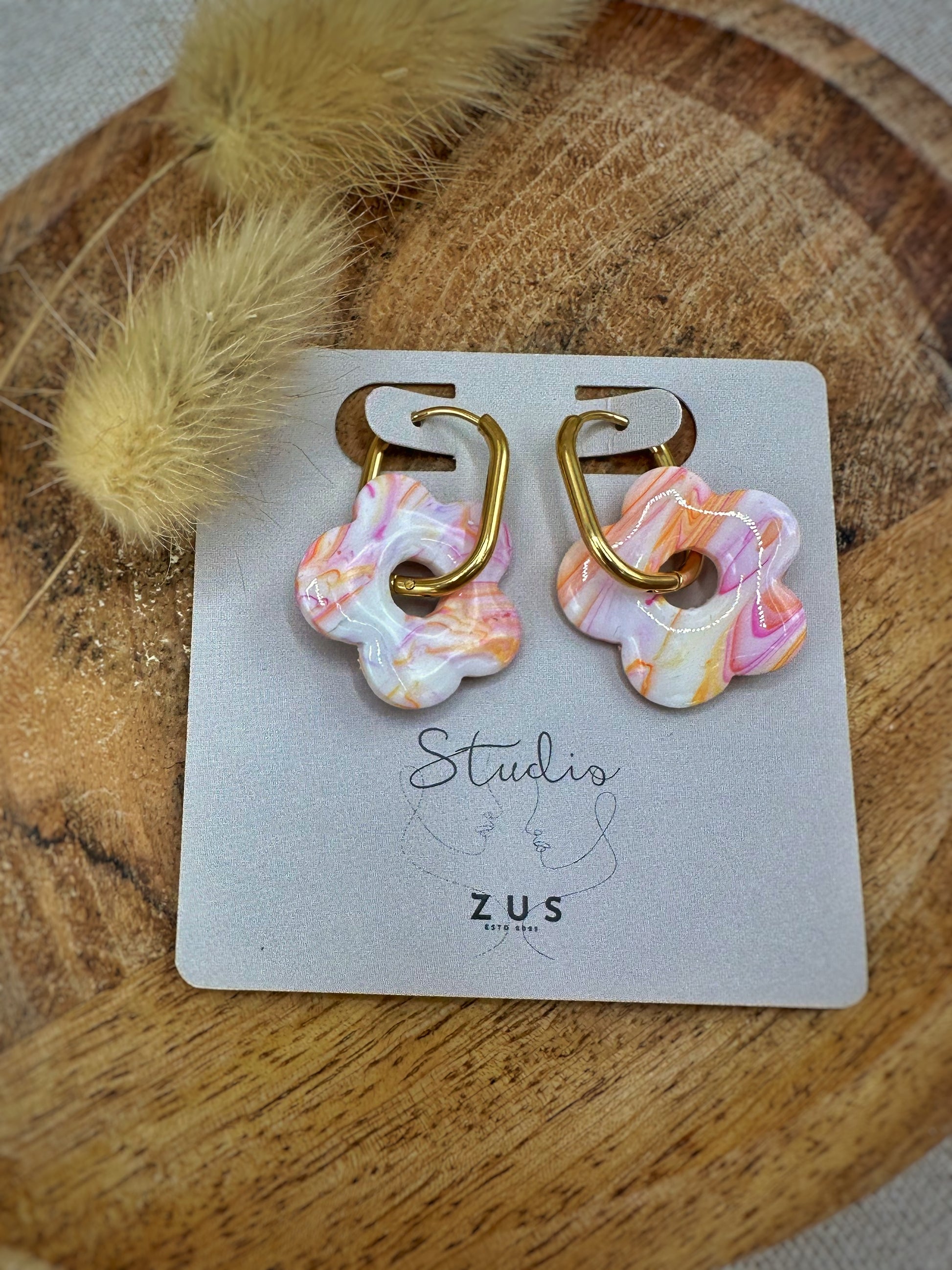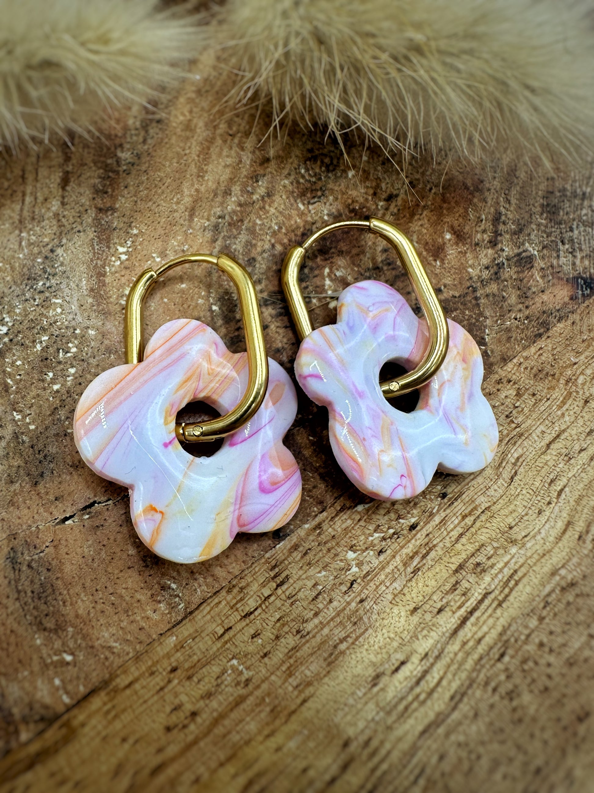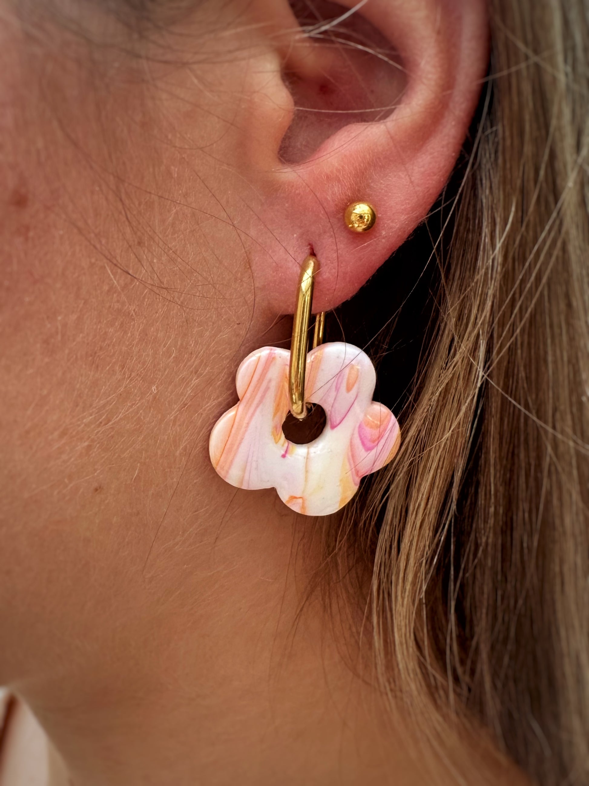 De oorbellen Milou zijn een stijlvolle combinatie van speels en chic. De bloemvormige hanger met een marmerpatroon in wit, roze en oranje zorgt voor een frisse en zomerse uitstraling. De gouden ring maakt het ontwerp compleet en geeft deze oorbellen een elegante finishing touch.