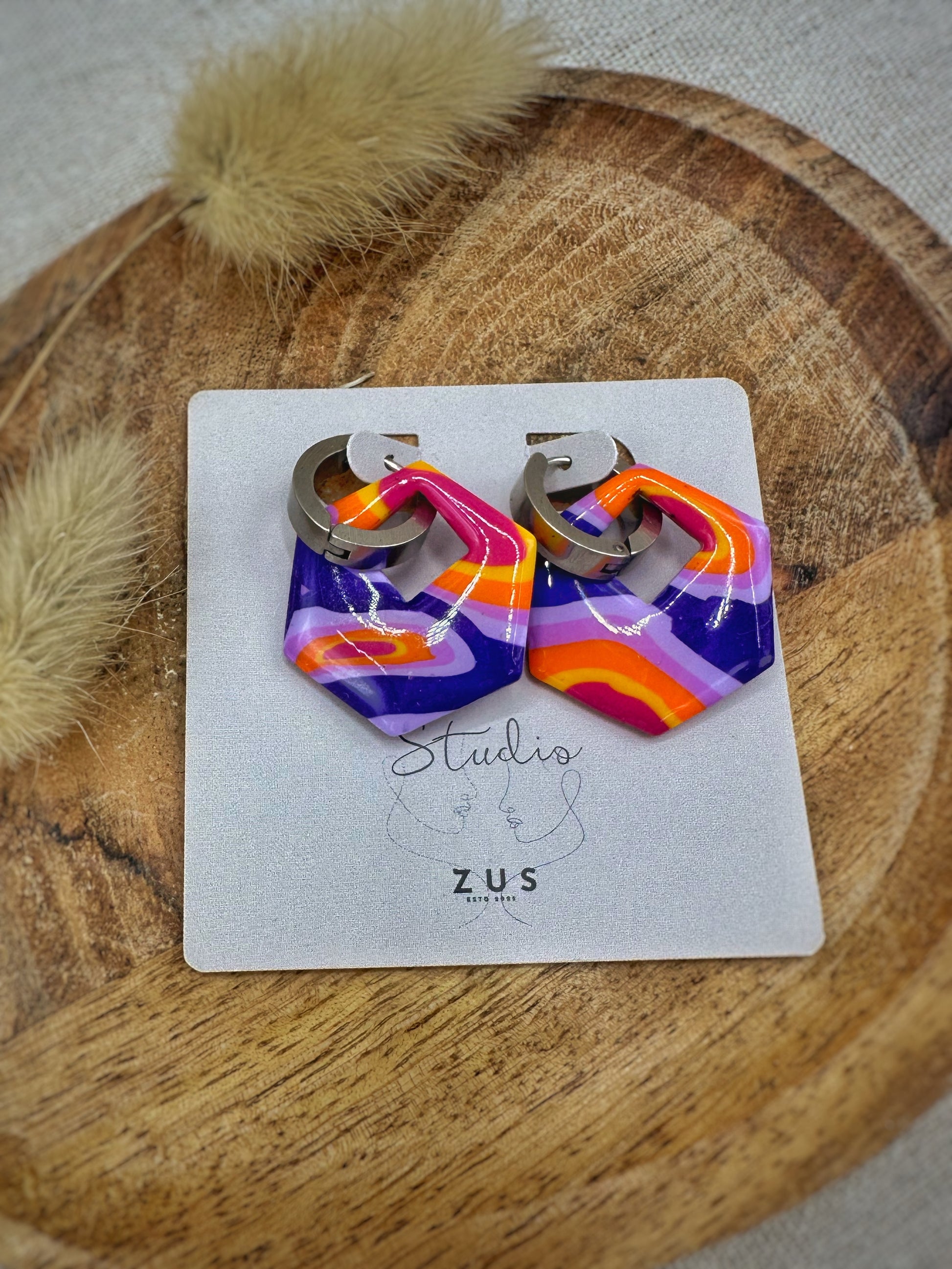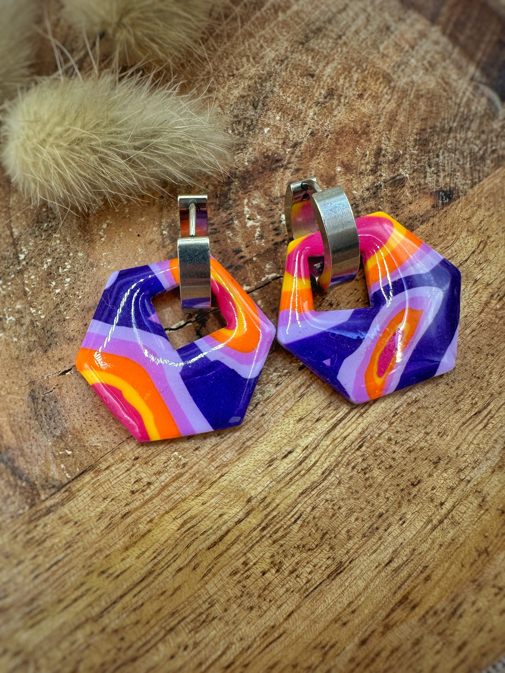 De oorbellen Tess hebben een krachtige en speelse uitstraling. De zeshoekige hanger in een levendig kleurenpalet van paars, oranje, roze en rood maakt deze oorbellen tot een echte eyecatcher. Dankzij de strakke vorm en moderne look zijn ze perfect voor wie houdt van opvallende sieraden met een creatieve twist.