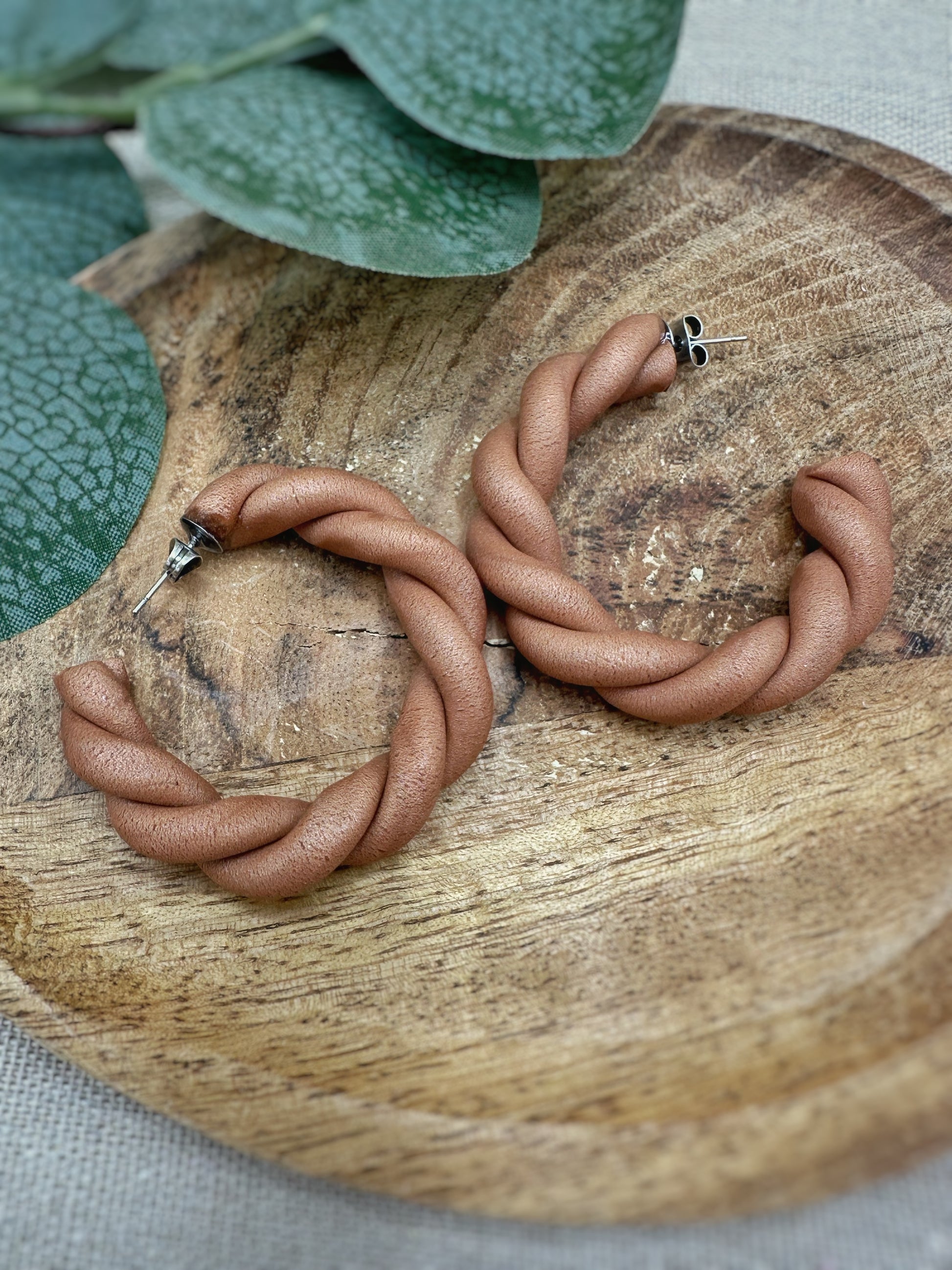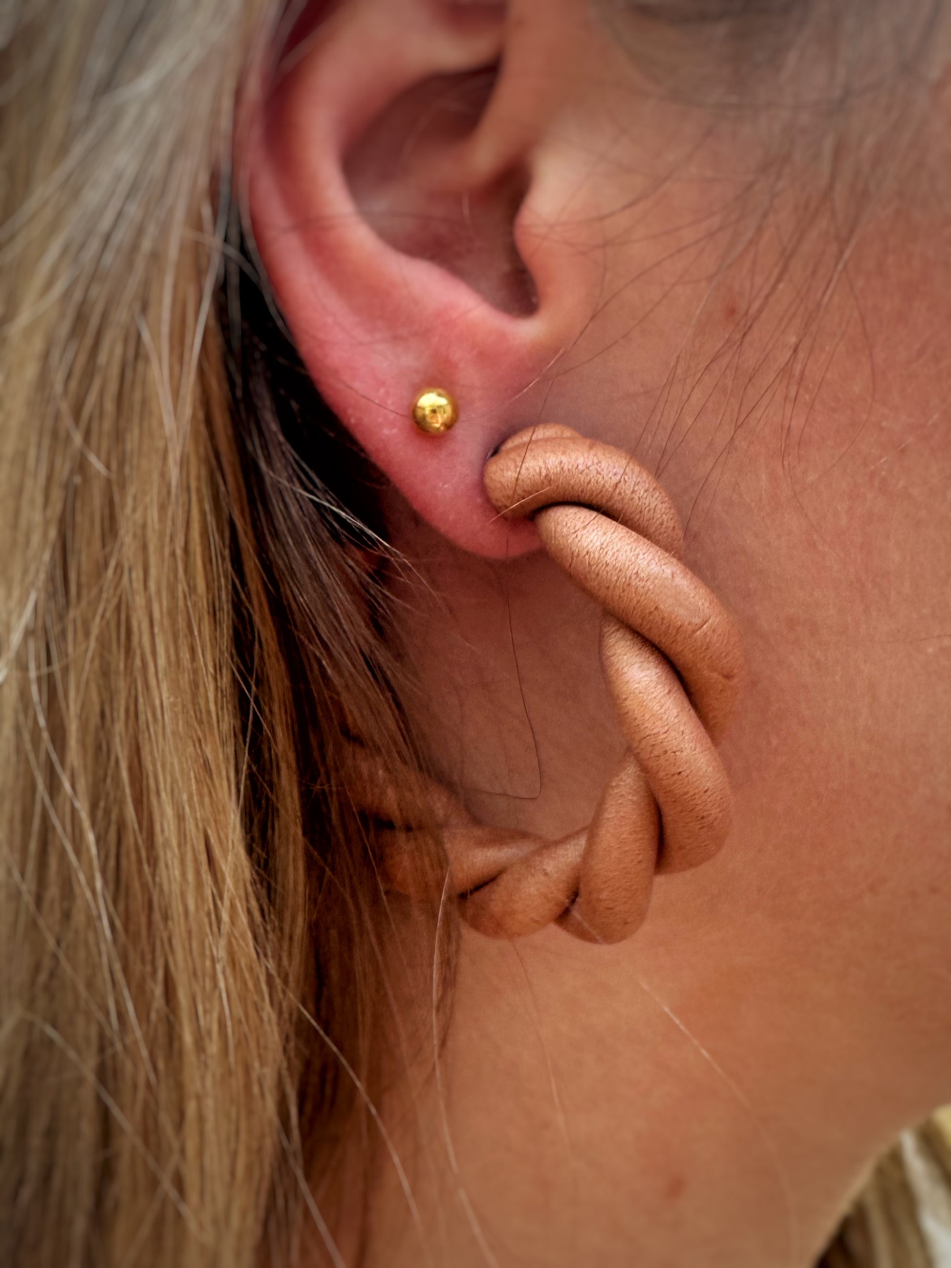De oorbellen Saar in de kleur Kaneel stralen warmte en vrouwelijkheid uit. De ronde vorm met subtiel breipatroon en diepe terracotta tint maken ze een speelse blikvanger voor het najaar.
